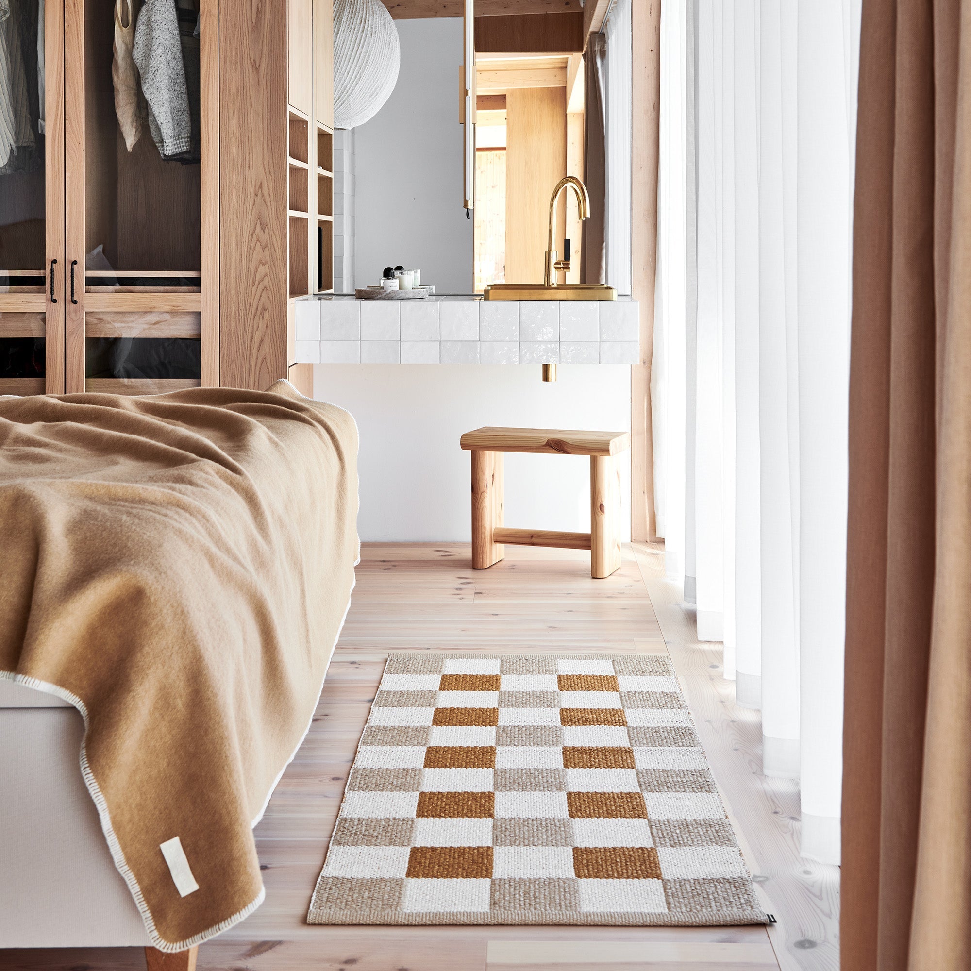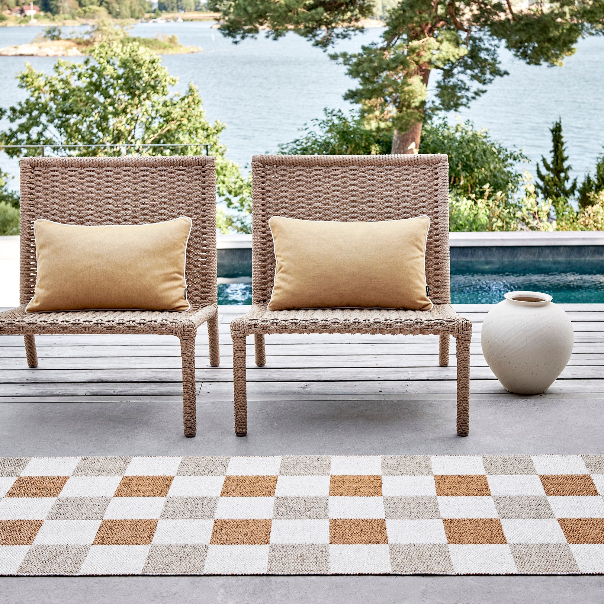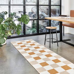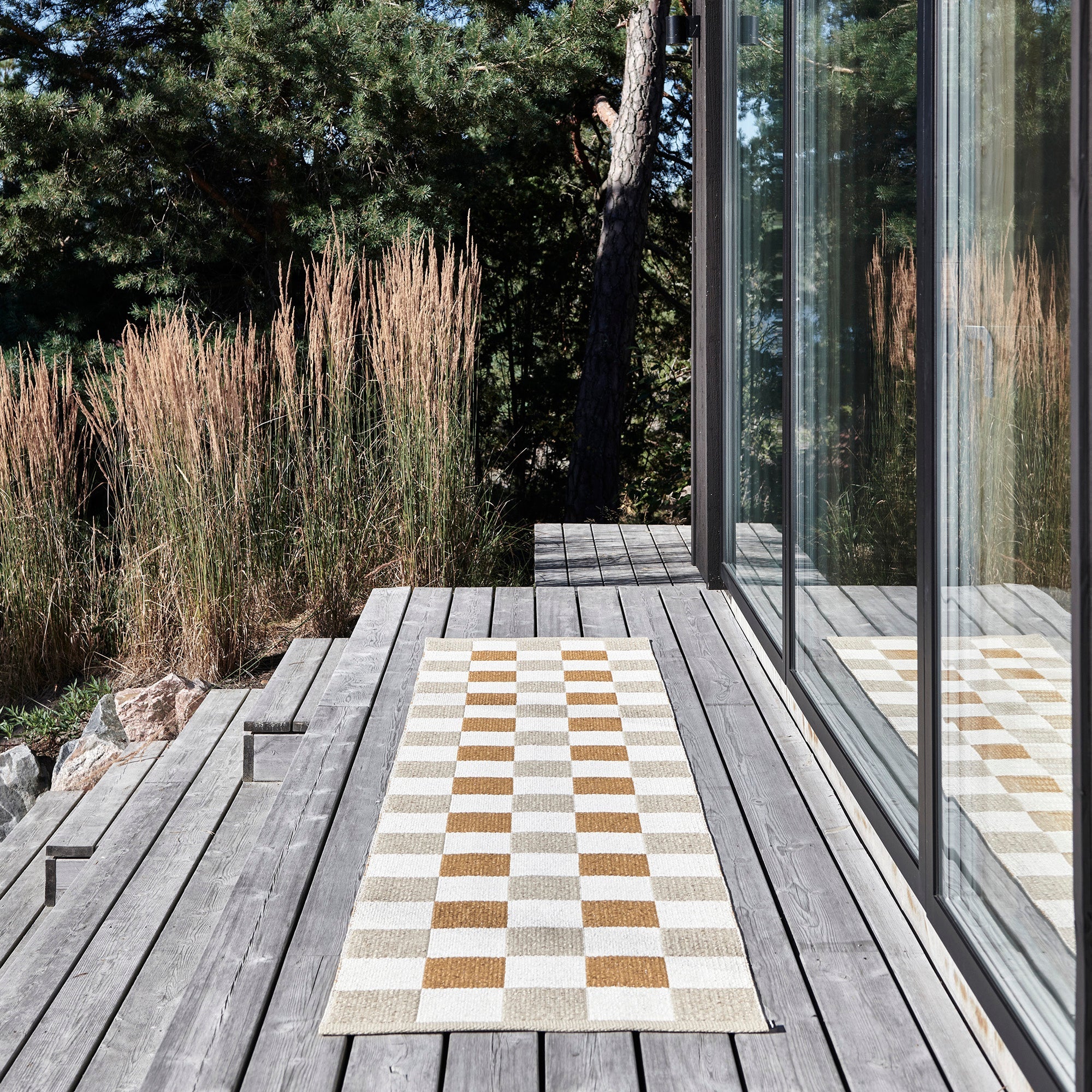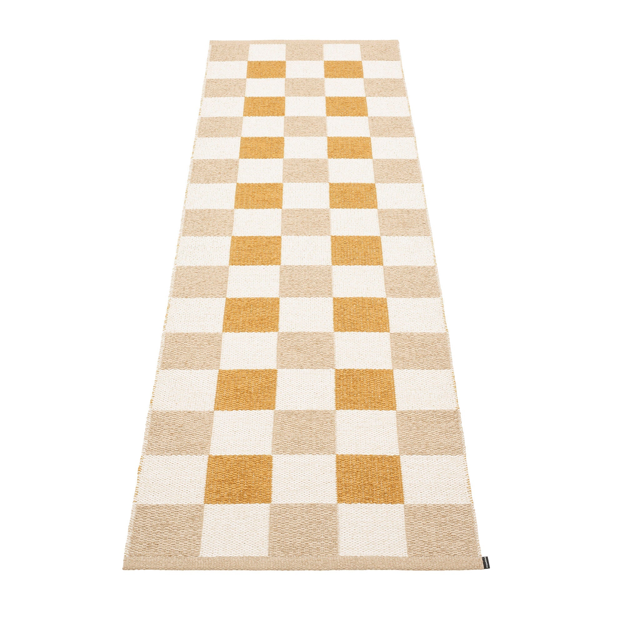 The Pappelina Rugs are woven on a traditional loom using wooden shuttles. For indoor or outdoor use, the rugs are reversible, machine-washable, and made from Swedish-manufactured certified PVC. Each rug features reinforced, welded edges for strength and durability.