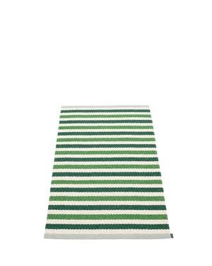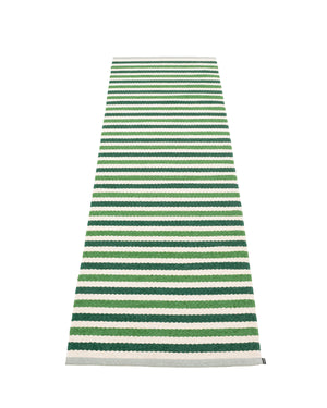 The TEO Rugs are woven on a traditional loom using wooden shuttles. For indoor or outdoor use, the rugs are reversible, machine-washable, and made from Swedish-manufactured certified PVC. Each rug features reinforced, welded edges for strength and durability.
