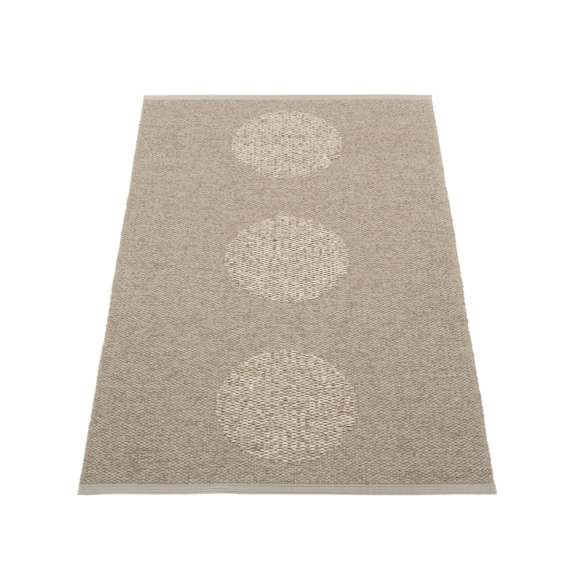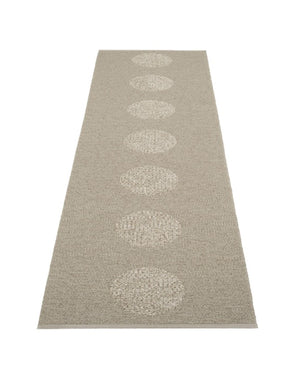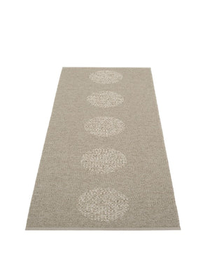 The VERA Rugs are woven on a traditional loom using wooden shuttles. For indoor or outdoor use, the rugs are reversible, machine-washable, and made from Swedish-manufactured certified PVC. Each rug features reinforced, welded edges for strength and durability.