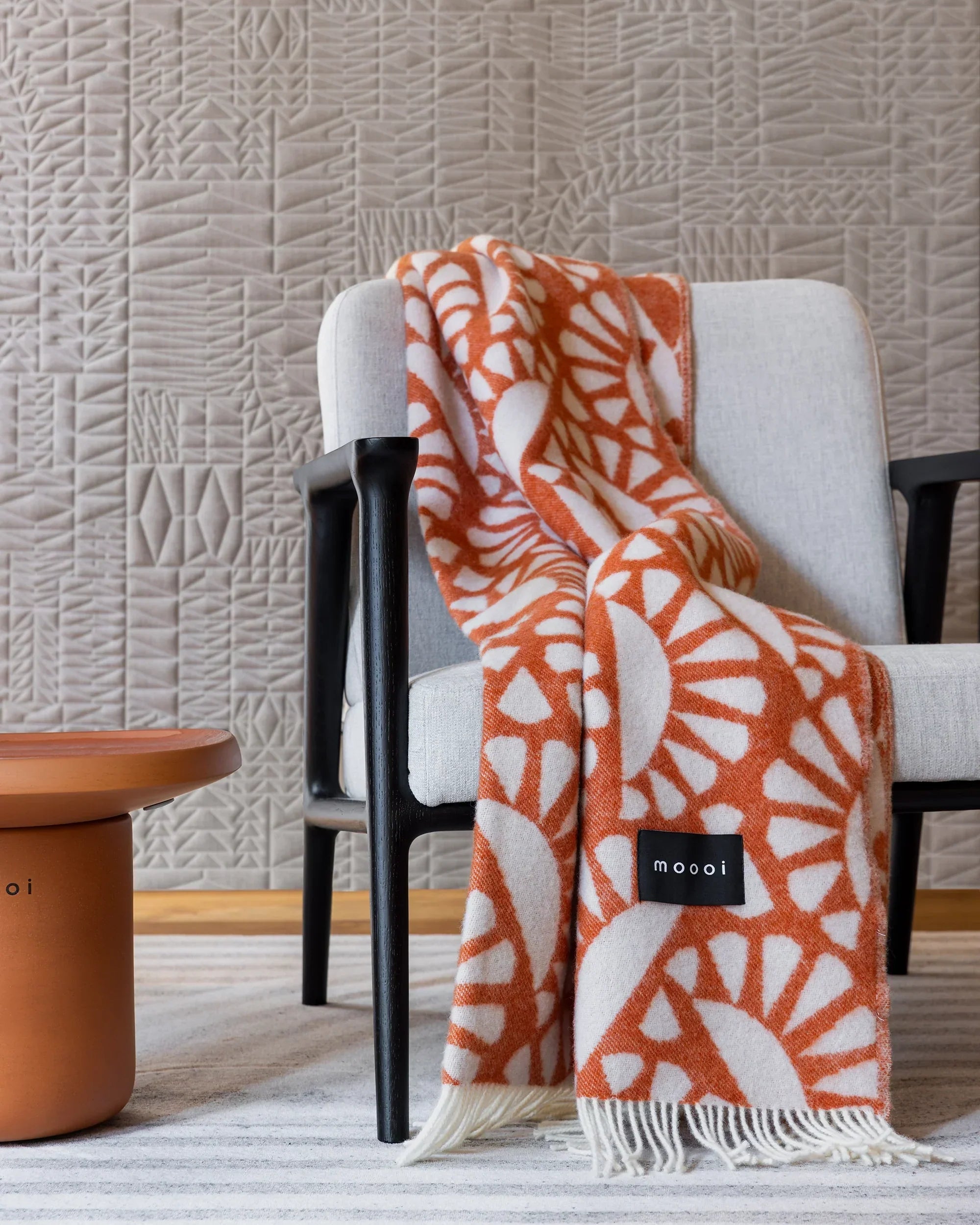 The Woodblock Beetle Blanket Rust Cream is woven in Lithuania and certified with the Woolmark, OEKO-TEX and Wool Integrity ™ labels. Wool is 100% biodegradable and therefor does not contribute to microplastic pollution in our oceans or on our land. Wool is a circular fibre. It's 100% natural, 100% renewable and 100% biodegradable.