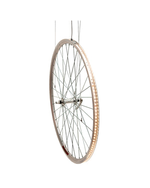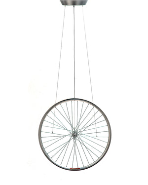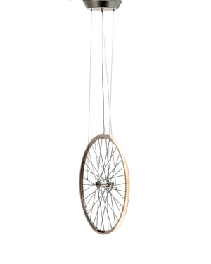 The Eddy Suspension lamp consists of an original die-cast aluminum wheel. High capacity Ledstrip, equipped with integrated thermal control chip. Chromed steel body (original component of the fork), infinity switch, aluminum cap with high quality hand-stitched eco-leather as a cover.