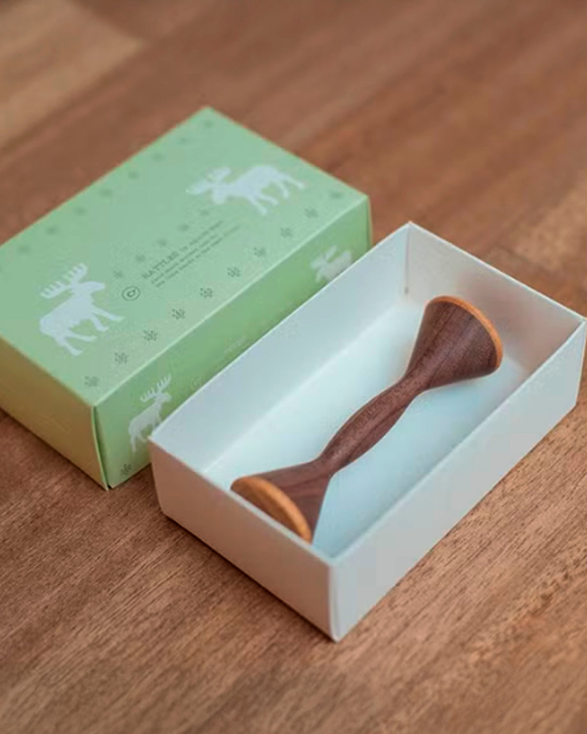 Delight your little one with this beautiful object of sound. This exquisitely designed horn rattle is made of walnut and beech wood. It will be passed down from sibling to sibling and serve as a fond memory for years to come.