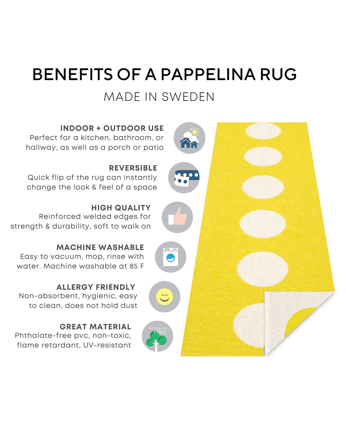 The EDIT Rugs are woven on a traditional loom using wooden shuttles. For indoor or outdoor use, the rugs are machine-washable and made from Swedish-manufactured certified PVC. Each rug features reinforced, welded edges for strength and durability.