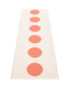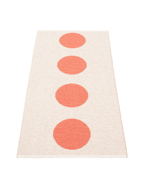 The Pappelina Rugs are woven on a traditional loom using wooden shuttles. For indoor or outdoor use, the rugs are reversible, machine-washable, and made from Swedish-manufactured certified PVC. Each rug features reinforced, welded edges for strength and durability.