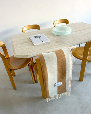 The Rough Stripe Blanket is jacquard-woven from 100% New Zealand wool with fringes on the short sides.
