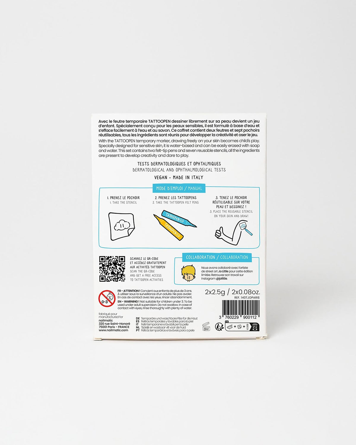 Travel to NYC with this limited edition tattoo set by street artist Jo Little! Includes 2 washable tattoo pens (Pink & Green) and 7 reusable stencils inspired by the Big Apple. Safe for face and body, dermatologically tested, and easy to remove with soap and water