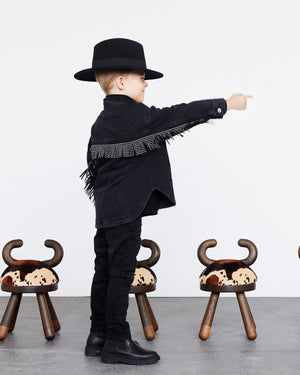 EO's chair series are objects made from the heart; these are true sculptures, fine art almost, that make for beautiful children's chairs. Cow Chair has a sculptural back formed like small horns and a dark appearance matching the seat in faux cow skin.