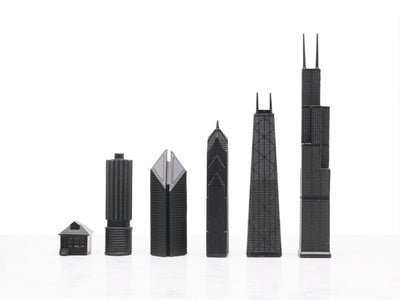 The chess set of Chicago’s most iconic structures; including Marina City, The Crain Communications Building, Two Prudential Plaza, The John Hancock Center and Willis Tower.