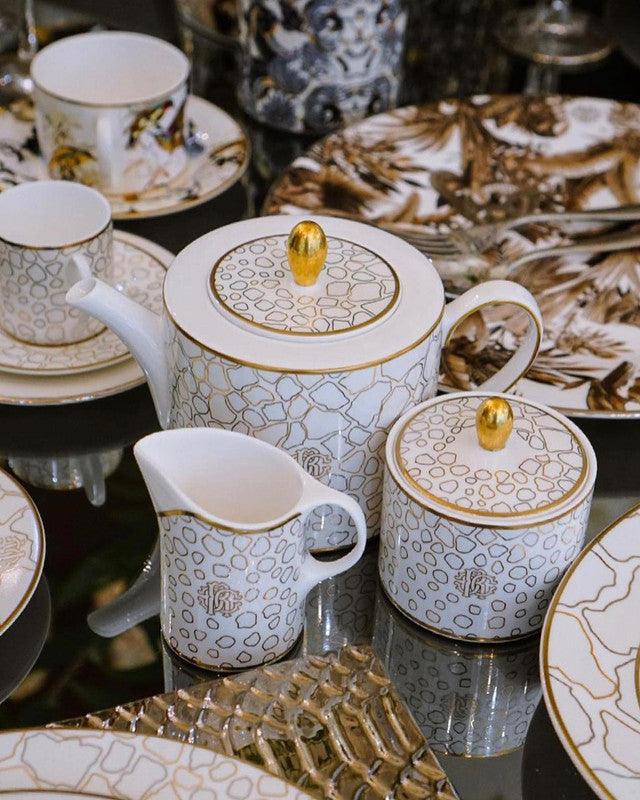 The exquisite Giraffe collection by Roberto Cavalli is crafted on pristine white bone china, featuring an elegant gold and platinum outline design. A gold rim and the meticulously positioned Roberto Cavalli logo complete this sophisticated collection.
