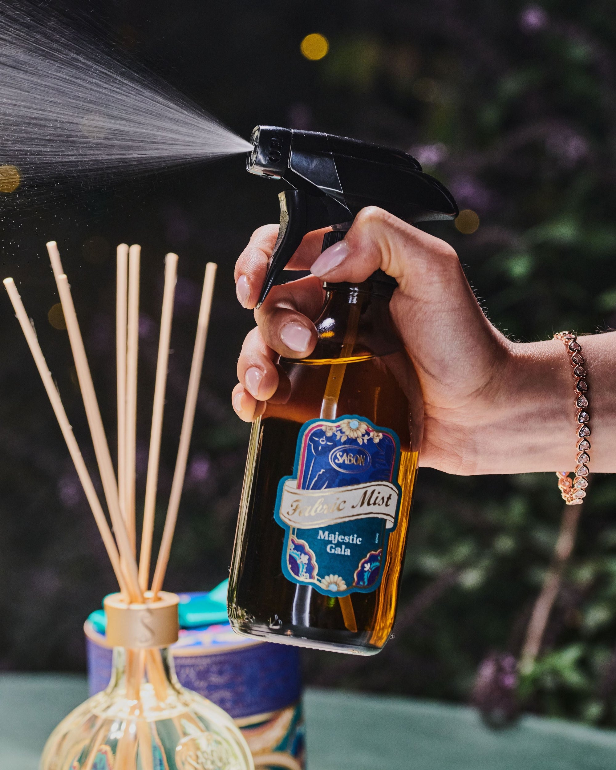 Refresh your world with the Majestic Gala Fabric Mist. A light spritz instantly uplifts linens, clothes, and spaces with a festive fragrance that lingers like an elegant celebration.