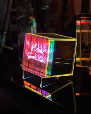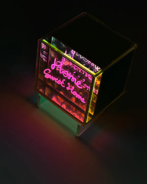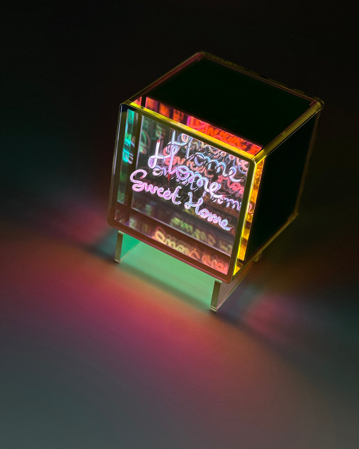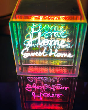 The Mitbox Home Sweet Home captures depth and glow in a striking way with its mirrored surface and iridescent acrylic. The soft LED light and “HOME SWEET HOME” message add a cozy, heartfelt accent—ready to display with the included elegant stand.