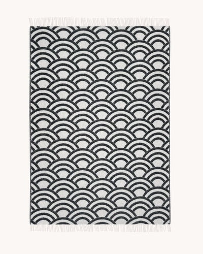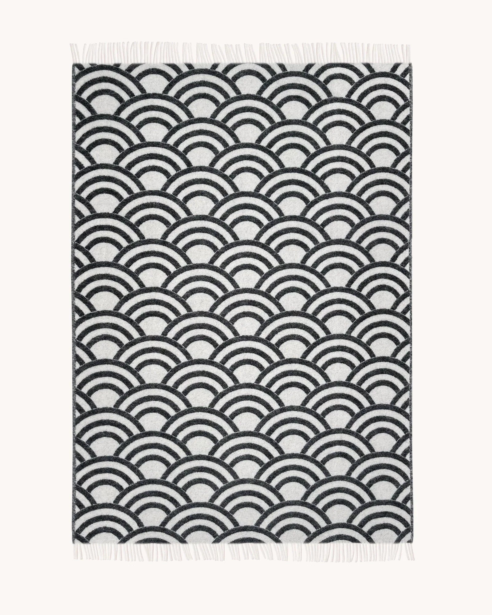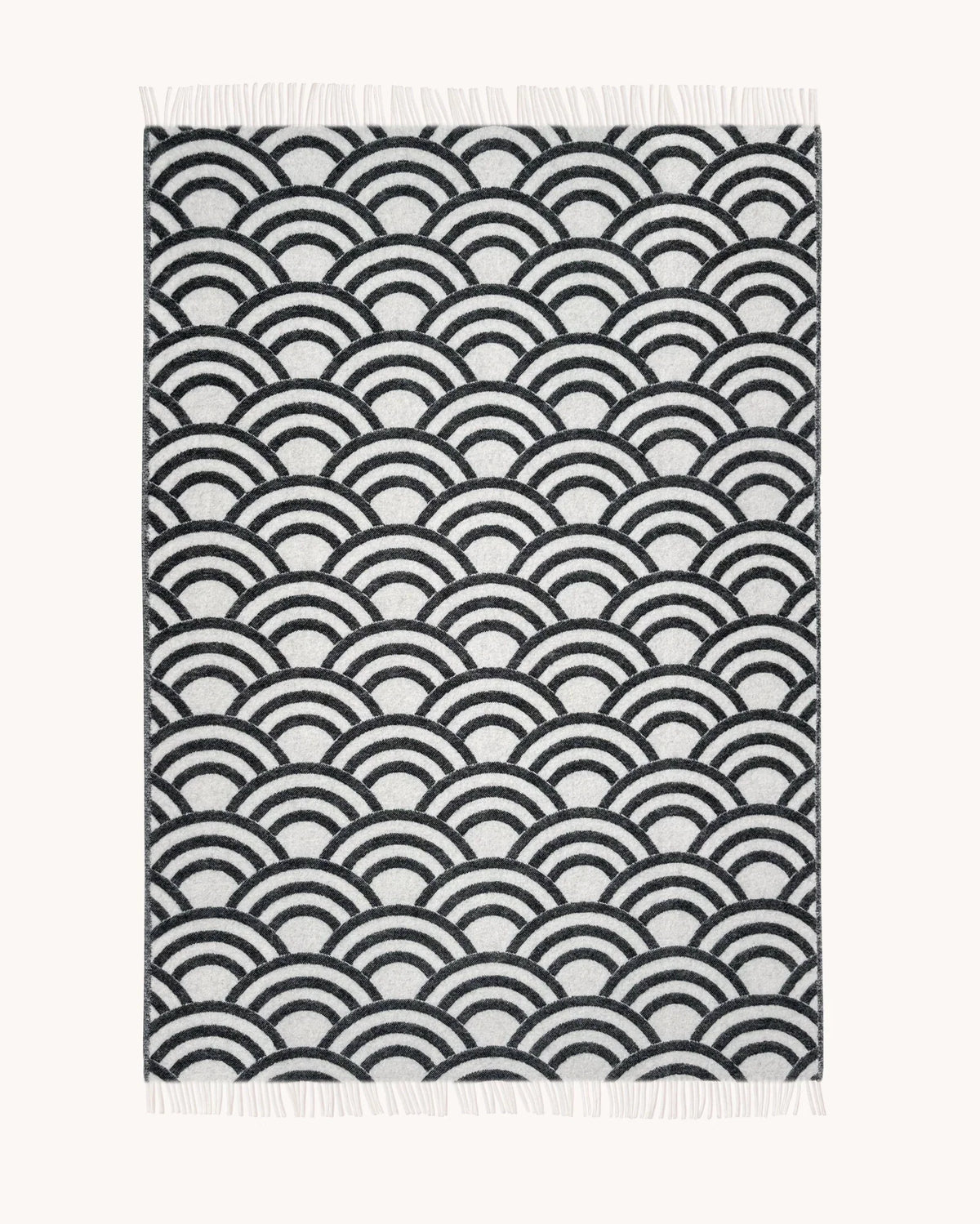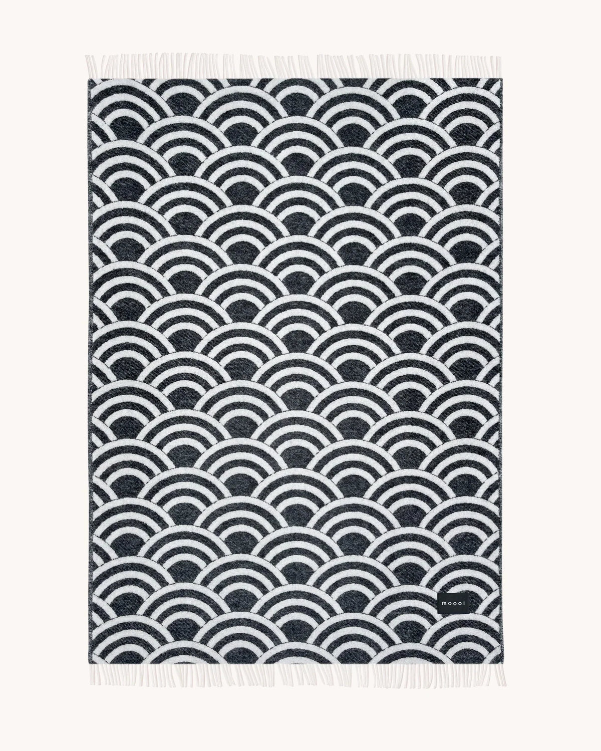 Crafted from heavyweight 100% pure new wool using jacquard weaving, this blanket evokes the undulating rhythm of ocean waves. Its distinctive Seigaiha pattern, an ancient symbol representing luck, strength, and resilience, adorns the fabric. The Lucky O’s blanket boasts versatility with its reversible design and generous dimensions measuring 130 x 200 cm.
