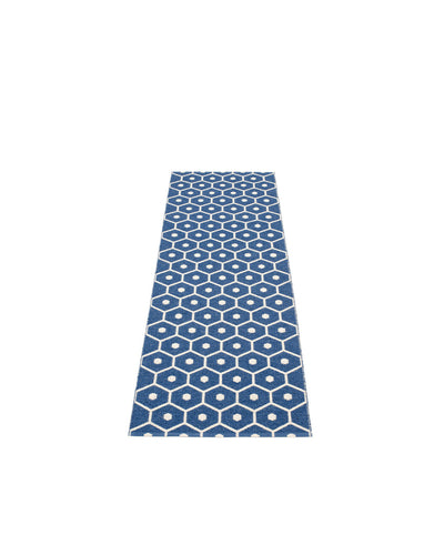 The HONEY Rugs are woven on a traditional loom using wooden shuttles. For indoor or outdoor use, the rugs are reversible, machine-washable, and made from Swedish-manufactured certified PVC. Each rug features reinforced, welded edges for strength and durability.