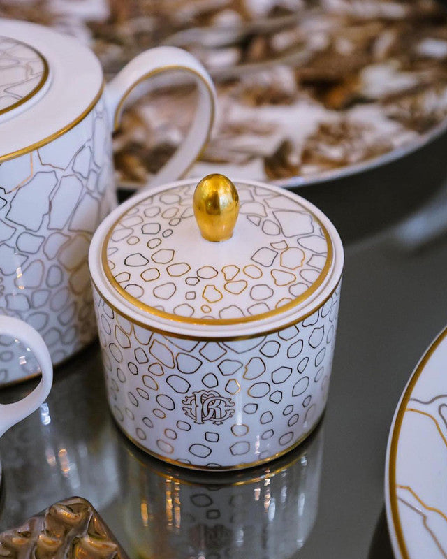 Roberto Cavalli Home Sugar Pot GIRAFFE is crafted from pristine white bone china and adorned with an elegant gold and platinum outline design. Finished with a refined gold rim and the signature Roberto Cavalli logo, it adds timeless sophistication to the table.