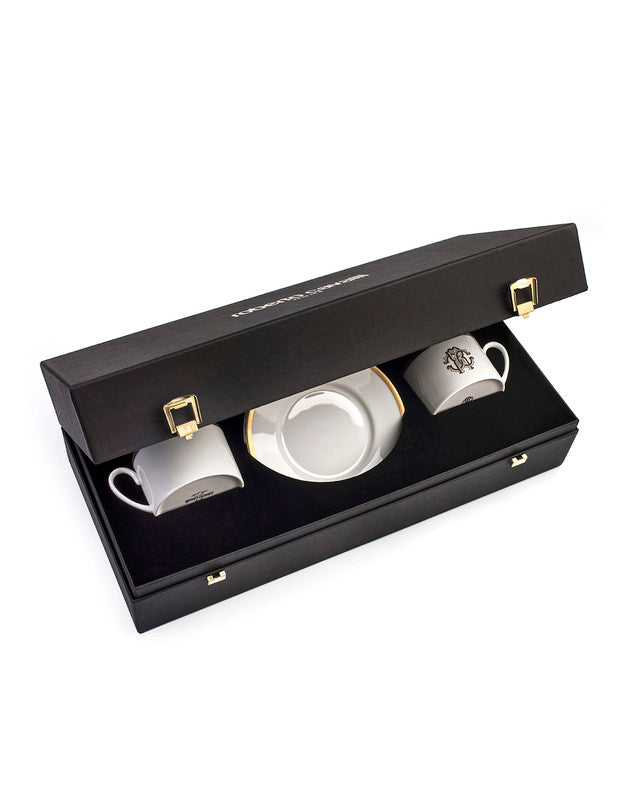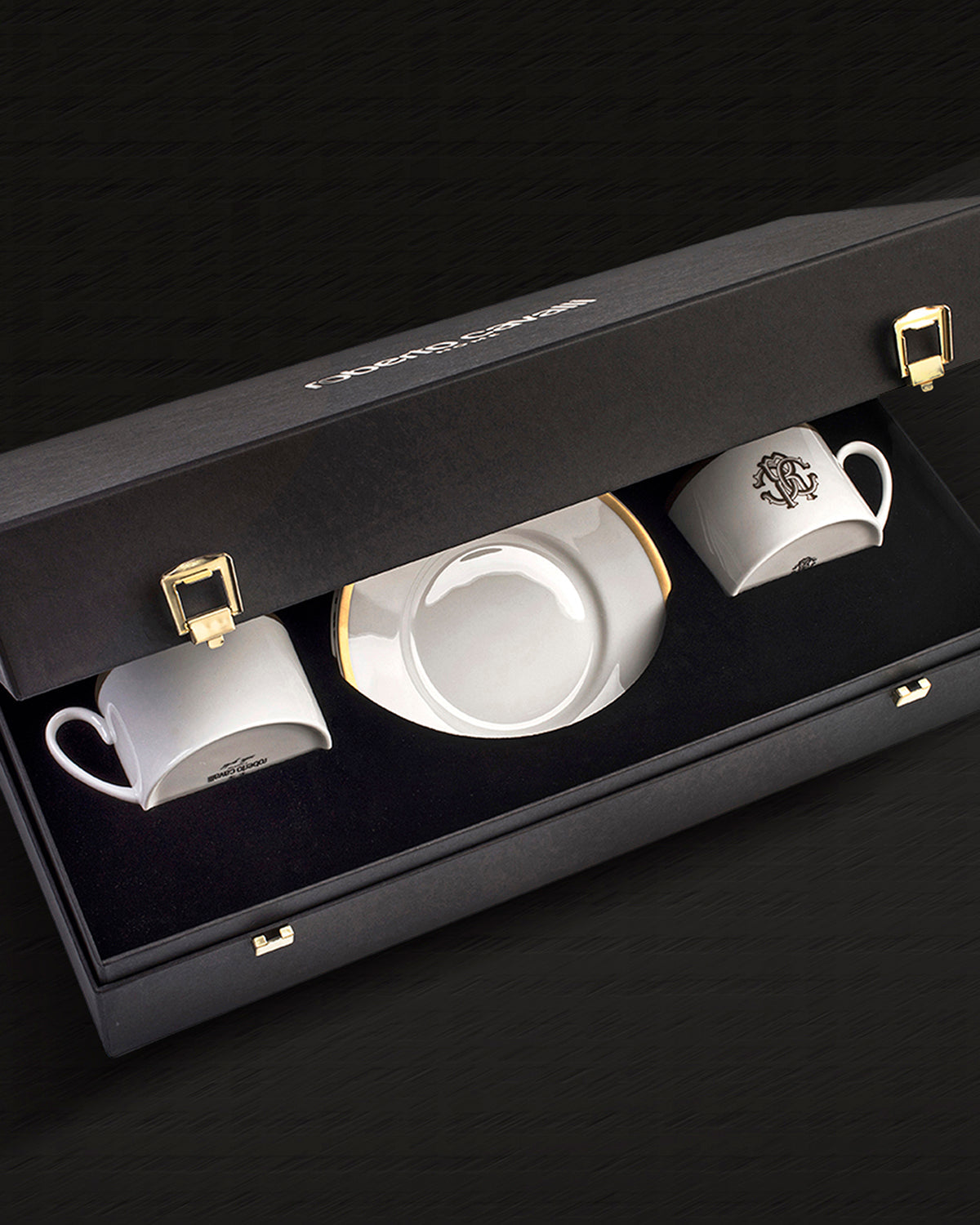 The Roberto Cavalli Home Tea Cup & Saucer SILK Set of 2 in Luxury Box – Gold embodies the understated elegance of the Silk Gold collection. Defined by a monochrome, austere façade accented with a refined golden thread, it leaves space for imagination while the Roberto Cavalli logo affirms luxury made in Italy.